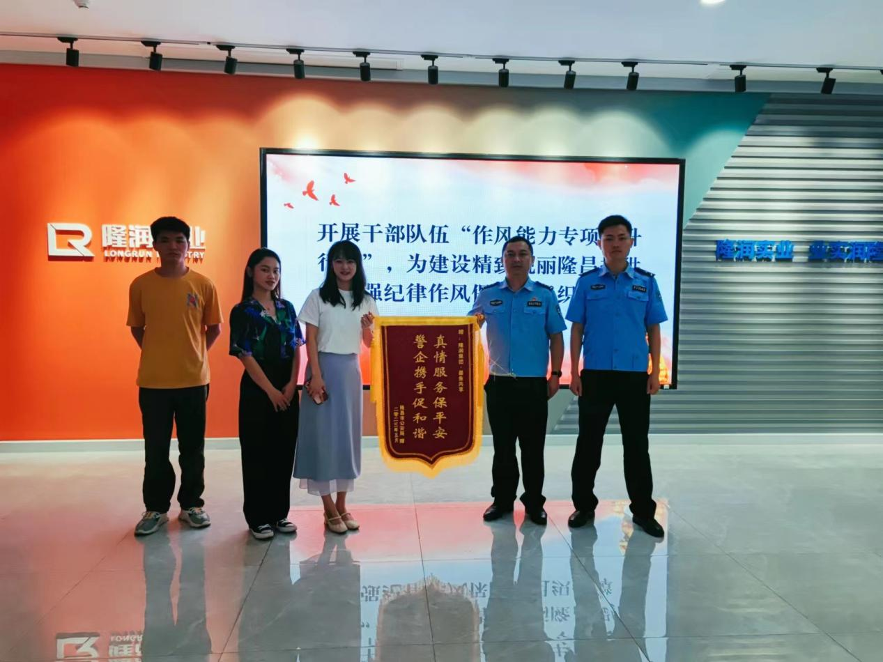 2023年5月29日,隆昌市公安局兩名警官專程代表市公安局為隆潤集團送來“真情服務(wù)保平安,警企攜手促和諧”錦旗。投資發(fā)展部代隆潤集團接收了錦旗。