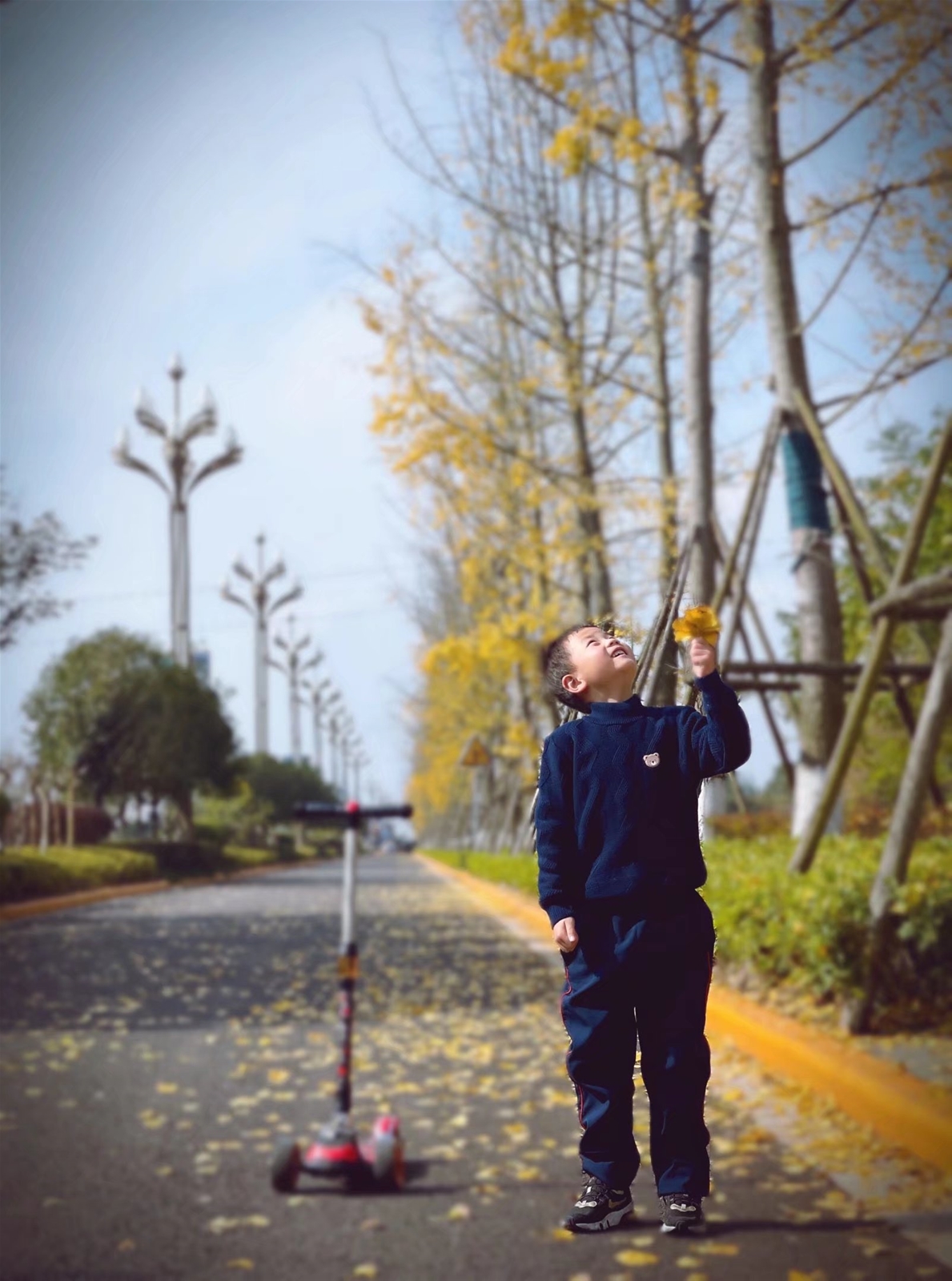 初冬時節的向陽路,你看那大道兩旁成排的銀杏樹已悄然上演“換裝大秀”。不知何時,青蔥的銀杏葉逐漸染上灰黃,一身樸素的綠衣已經被金黃耀眼的華服所替代。微風拂過,紛紛揚揚地渲染出浪漫唯美的初冬氛圍。