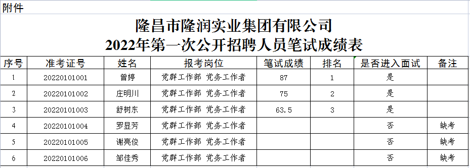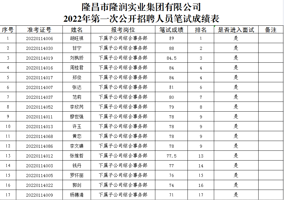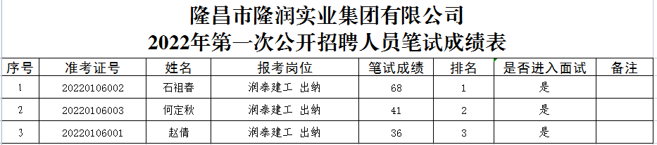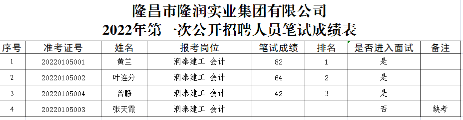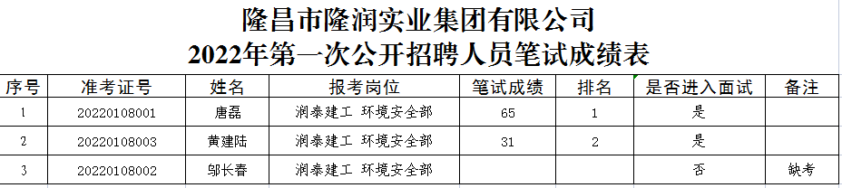 根據隆昌市隆潤實業集團有限公司《2022年第一次公開招聘公告》相關規定,現將筆試成績公示(詳見附表)。