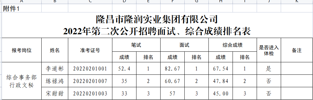 根據(jù)隆昌市隆潤實(shí)業(yè)集團(tuán)有限公司《2022年第二次公開招聘公告》相關(guān)規(guī)定,現(xiàn)將面試、綜合成績公示(詳見附表)。公示時(shí)間:2022年10月12日-18日,如需要反映情況,以真實(shí)姓名向隆昌市隆潤實(shí)業(yè)集團(tuán)有限公司電話、書面反映或面談,聯(lián)系電話:0832-3988810,地址:隆昌市雙創(chuàng)示范園(隆昌市金鵝街道重慶路368號(hào))1號(hào)樓。