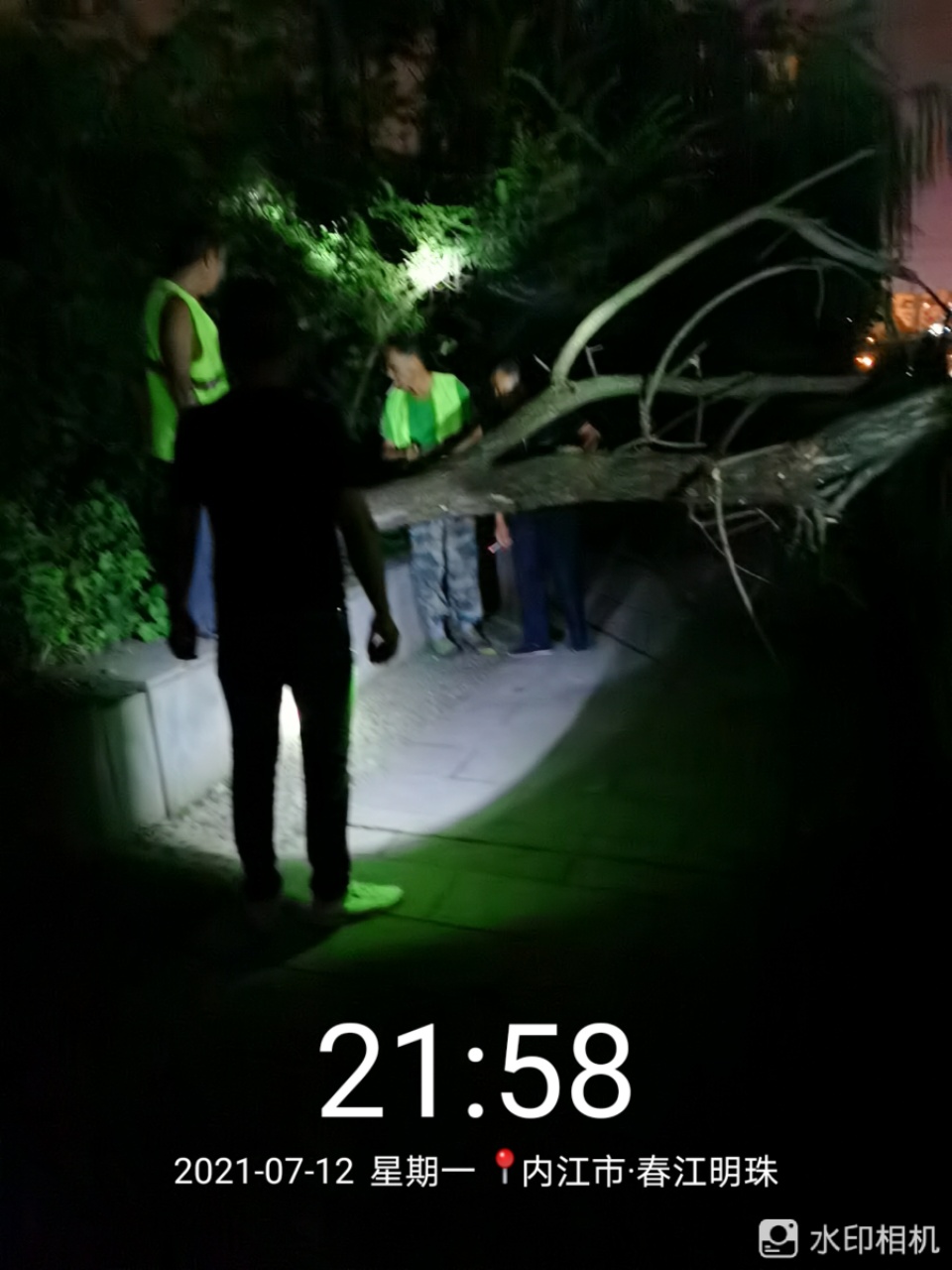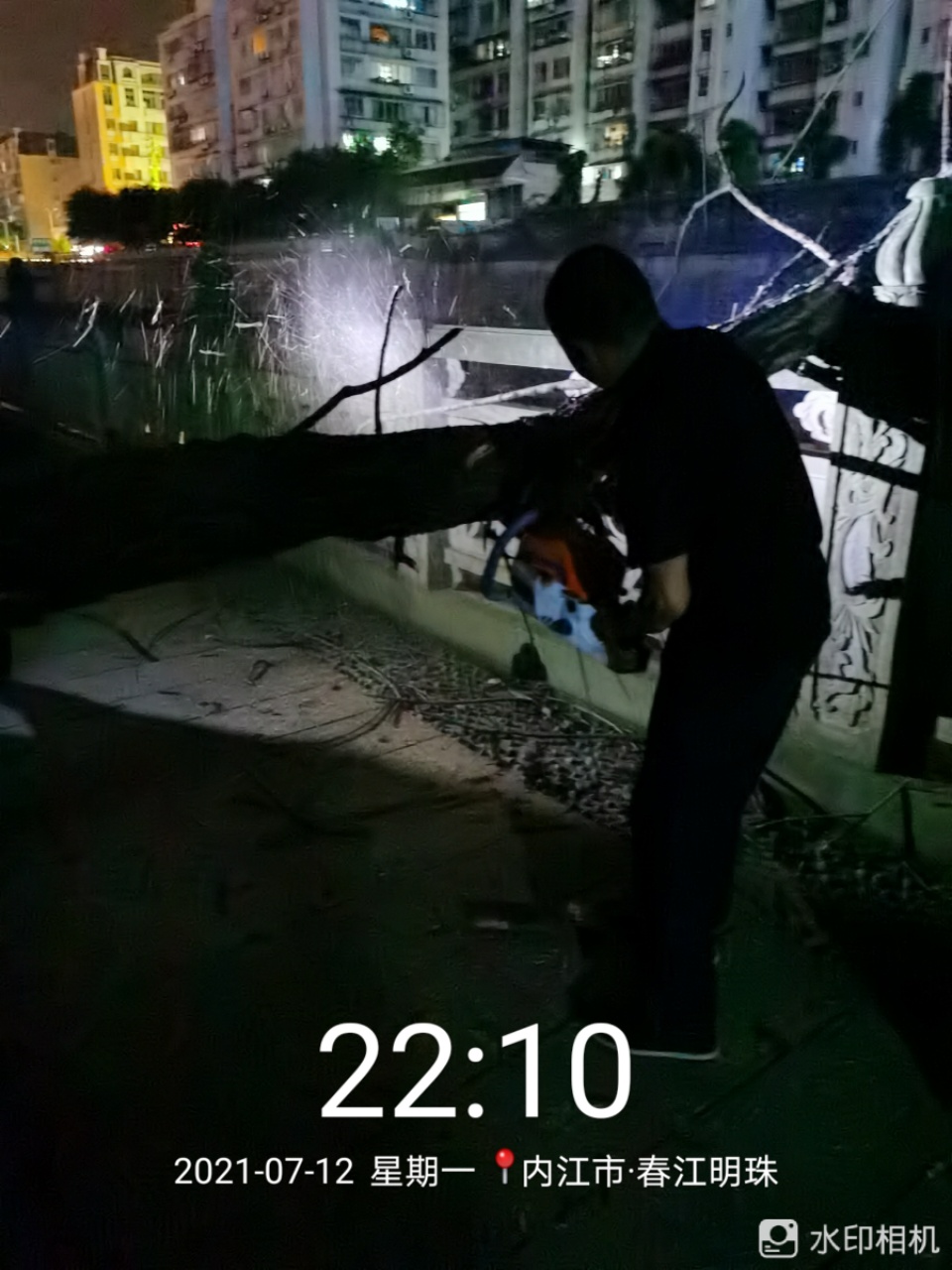 2021年7月12日21:40接市政府辦值班領(lǐng)導(dǎo)電話通知,多名群眾反映春江明都小區(qū)往新拱橋方向河道邊一株大型喬木橫倒在人行道中間,對群眾的出行造成了極大的不便,同時(shí)存在極大的安全隱患。我公司接到通知后立即組織相關(guān)人員并啟動(dòng)綠化應(yīng)急排危機(jī)制。經(jīng)現(xiàn)場查勘,此路段綠化并不在公司管護(hù)轄區(qū)范圍,是一株自然生長的野喬木枯亡橫倒。隆潤公司籌備組成員何吉賓同志做出重要指示:“安全隱患就是命令,到達(dá)了現(xiàn)場就要本著為人民群眾辦實(shí)事的宗旨,想辦法在第一時(shí)間內(nèi)把安全隱患排除掉,給廣大人民群眾提供幫助,同時(shí)大家一定注意夜間施工安全”。隨即調(diào)來一輛工程車和5名工人,大家?guī)瞎ぞ撸瑲v時(shí)1小時(shí)終于把這株橫倒在道路中間的野喬木清理干凈,及時(shí)清除了隱患。此舉贏得了老百姓的高度贊揚(yáng)。