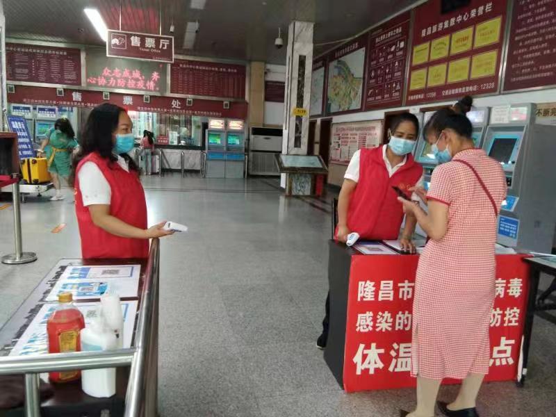 志愿者在汽車站候車廳內引導旅客查驗疫苗接種情況、對已接種新冠肺炎疫苗未使用智能手機的旅客進行信息登記,為旅客檢測體溫、落實健康碼查驗要求;對職工、駕乘人員、旅客進站落實“四川天府健康通”的“亮碼”“掃碼”工作,每天查驗達5千余人次。